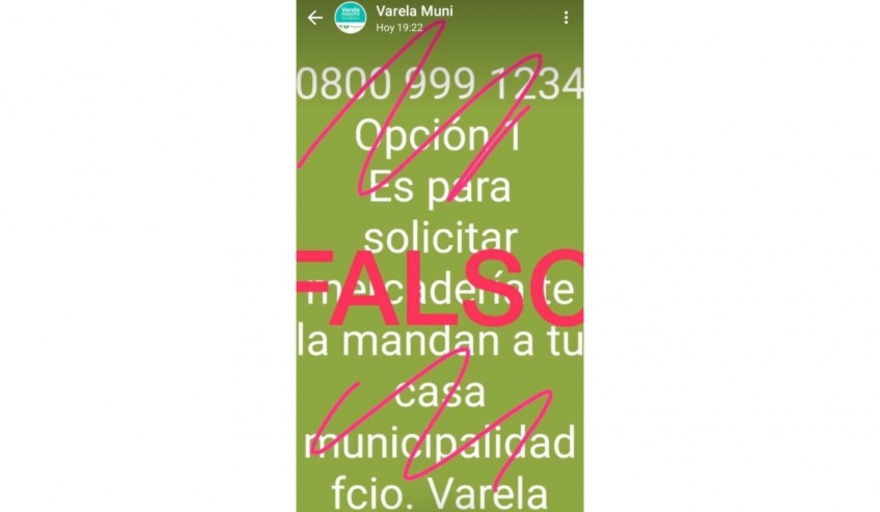 "0800 999 1234. Opción 1. Es para solicitar mercadería, te la mandan a tu casa. municipalidad fcio Varela", dice el texto que circuló en las últimas horas.