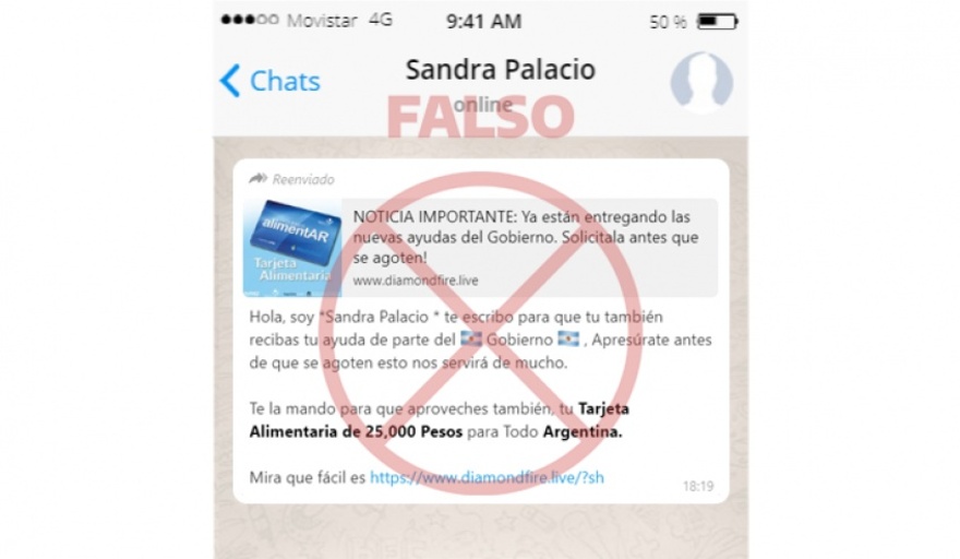 "Te escribo para que tu también recibas tu ayuda de parte del Gobierno, Apresúrate antes de que se agoten esto nos servirá de mucho. Te la mando para que aproveches también, tu Tarjeta Alimentaria de 25,000 Pesos para Todo Argentina", señala el texto que se viraliza junto a un link para ingresar los datos personales.
