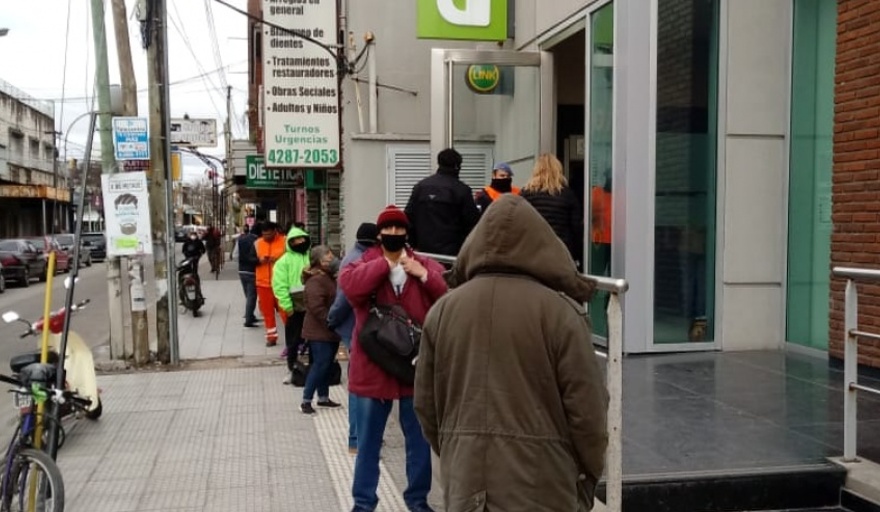 En el comienzo de la cuarentena estricta en el Área Metropolitana de Buenos Aires, nada cambió en los alrededores de los cajeros automáticos con largas filas para retirar dinero.