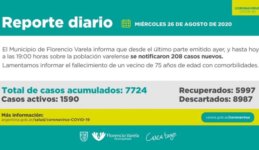 La dependencia municipal informó que, entre el último parte emitido y las 18:30 horas de ayer el Sistema Integrado de Información Sanitaria Argentino (SISA) reportó que, sobre la población del distrito, se registraron 208 nuevos contagios y un fallecimiento; los inactivos/recuperados se elevaron a 5.997; y los descartados por análisis de epidemiologia y/o laboratorio totalizan 8.987.