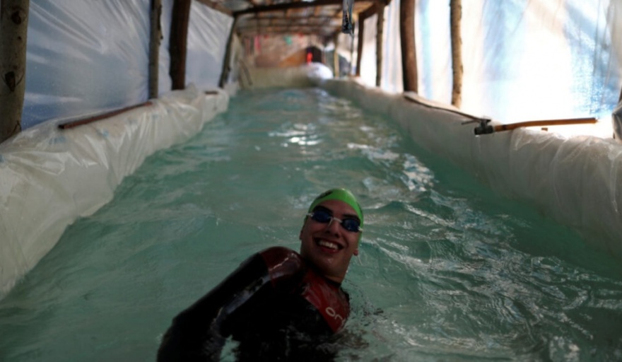 Maderas, chapas, nylon y una lona gigante conforman la pileta casera de 12,5 metros de largo, la mitad de lo que habitualmente utiliza en el Polideportivo La Patriada, con un tanque que se calienta a fuego para mantener el agua en una temperatura adecuada.