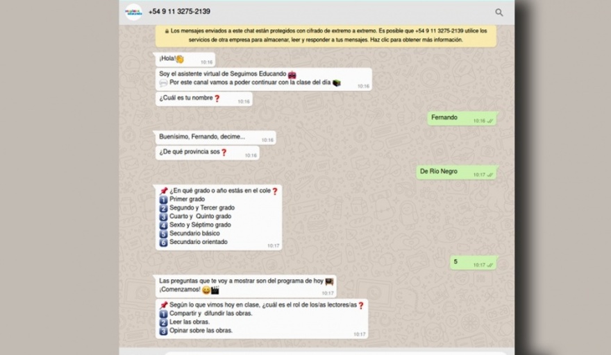 Los alumnos de primaria y secundaria que reciben educación a distancia y tienen poca conectividad a Internet podrán entablar conversaciones sobre los contenidos pedagógicos fijados en la plataforma del Ministerio de Educación "Seguimos Educando", a través de una línea de Whatsapp que los conectará con un "asistente virtual" o "chatbot", informó hoy la cartera educativa.