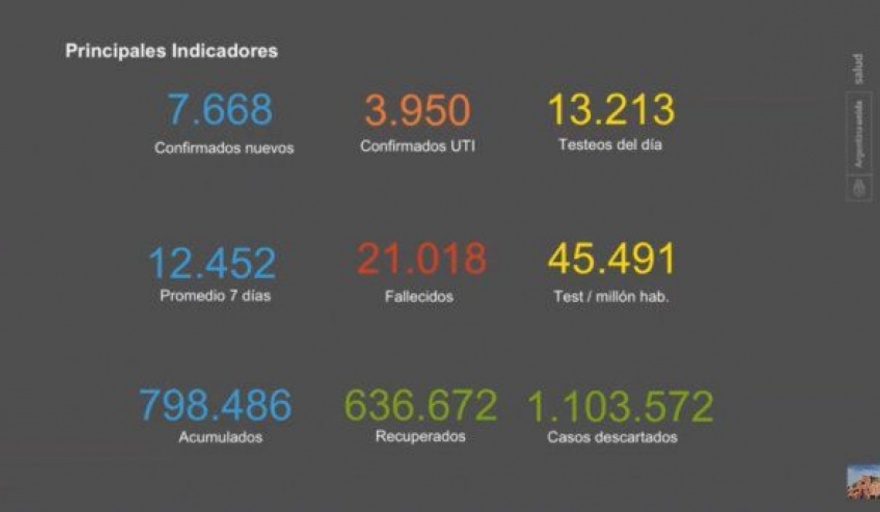 El Ministerio de Salud informó este lunes por la mañana un promedio diario de 12.452 casos de coronavirus en Argentina en los últimos siete días, con una tasa de mortalidad de 463 personas cada millón de habitantes y de letalidad del 2,6 % sobre los casos confirmados.