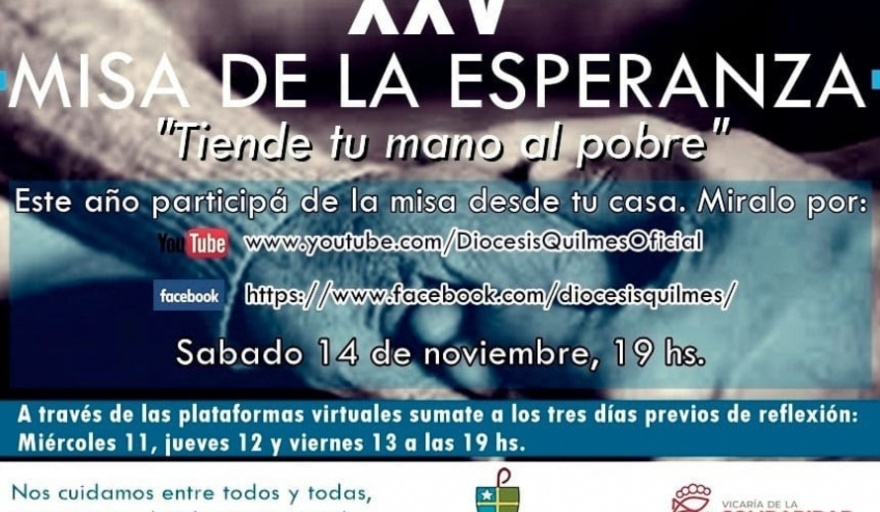 (Comunicación del Obispado de Quilmes) El sábado 14 de noviembre a las 19:00 horas, se realizará la XXV Misa de la Esperanza con la consigna “Tiende tu mano al pobre”, en esta oportunidad de manera virtual, transmitida por www.youtube.com/DiocesisQuilmesOficial y por www.facebook.com/DiocesisQuilmes con la presencia del Obispo de Quilmes Carlos José Tissera, el Obispo Auxiliar Marcelo Julián (Maxi) Margni.