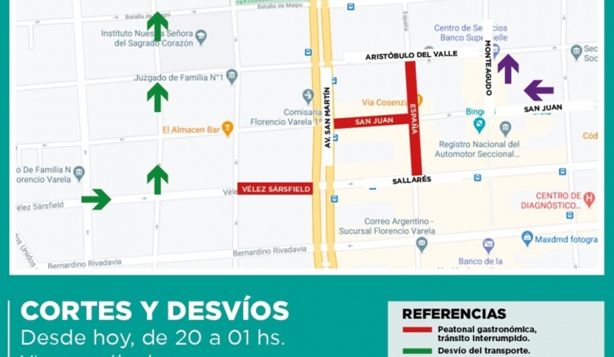 En principio desde esta noche, se prevén peatonalizaciones de las calles en puntos que concentran locales gastronómicos: Vélez Sarsfield, entre avenida San Martin y 25 de mayo; San Juan, entre San Martin y España; y en España, entre Sallarés y Aristóbulo de Valle.