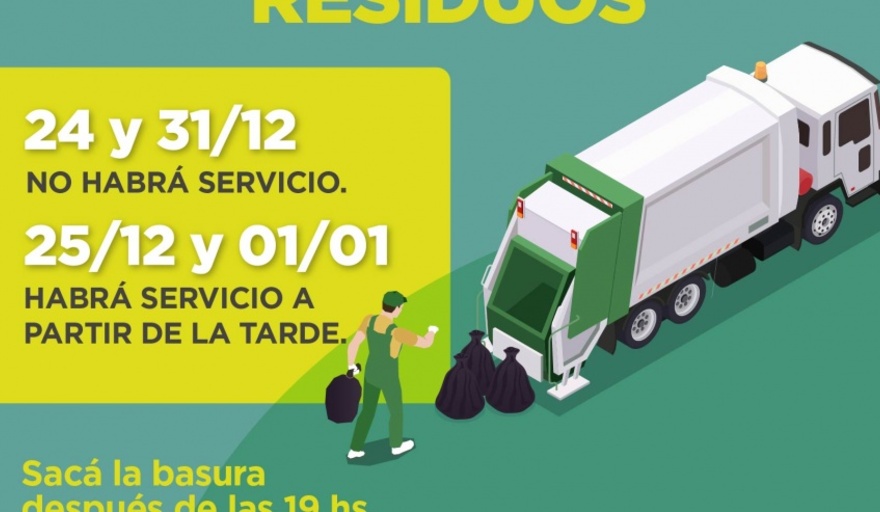 Asimismo, los días 24 y 31 de diciembre no habrá servicio de recolección de residuos domiciliarios. El 25 de diciembre y el primero de enero, el servicio comenzará a funcionar en horas de la tarde, por lo tanto, se sugiere que se saquen los desperdicios domiciliarios a partir de las 19:00 horas.