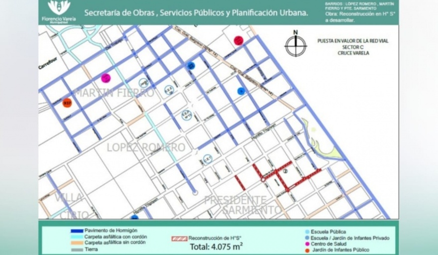 Como parte de un amplio plan de mejoras viales anunciado por el Ejecutivo Municipal para toda la zona de influencia del Cruce Varela, la secretaría de Obras, Servicios Públicos y Planificación Urbana informó hoy el inicio de las tareas de reconstrucción vial en los barrios Martín Fierro y López Romero. La restauración en hormigón comenzará el lunes 18 sobre una superficie total de 4.075 m2.