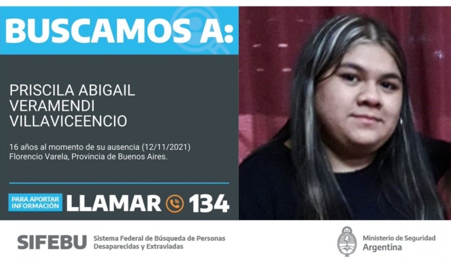 Priscila Veramendi, de 16 años, desapareció de su hogar del barrio Santa Ana, en la localidad de Bosques, y es intensamente buscada por familiares, amigos y allegados. Se cree que habría escapado con con un conocido de la familia, un hombre mayor sobre quien tampoco se conoce paradero.