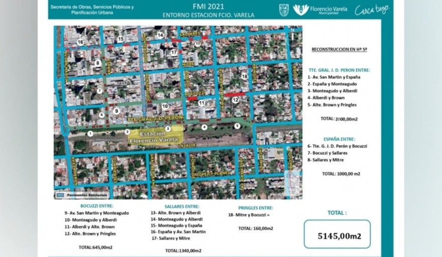 El proyecto, financiado con Fondos Provinciales–FIM 2021, contempla una superficie aproximada de 5.145 metros cuadrados de repavimentación en hormigón simple sobre diversos frentes: