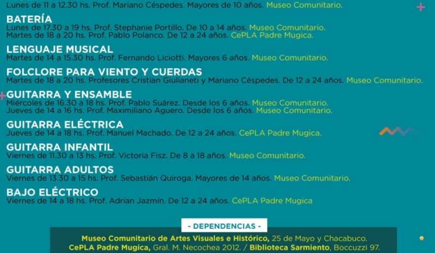 Guitarra y ensamble. Miércoles de 16.30 a 18hs Dictado por Pablo Suárez. / Jueves de 14 a 16hs. Dictado por Maximiliano Agüero. En ambos casos, para estudiantes mayores de 6 años.