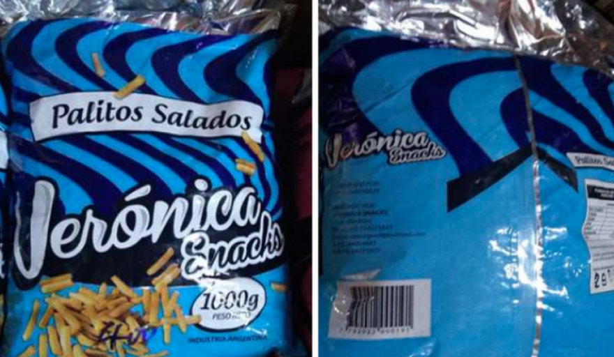 En otra Disposición publicada en el Boletín Oficial, la ANMAT prohibió la venta y comercialización del producto “Palitos salados marca Verónica Snacks, peso neto 1000 gr, sabores: Clásico, Jamón, Queso, Elaborado por: R.N.E: 040036624, Envasado por: Verónica Snacks, Luca, Córdoba, R.N.E: 04004883, R.N.P.A: 04035072”.