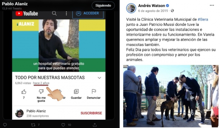 Pese a la escasa repercusión en la web, se le recordó al referente de Juntos por el Cambio que las iniciativas del Municipio comenzaron antes: en 2017 el intendente Andrés Watson visitó a Juan Patricio Mussi, por entonces al frente de Berazategui, para interiorizarse sobre el trabajo del Hospital Veterinario que funciona en la zona.