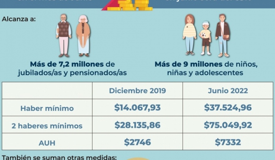 De esta forma, en el primer semestre del año todas las prestaciones acumularán un incremento del 29,12% que alcanzará a más de 7,2 millones de jubiladas, jubilados, pensionadas y pensionados y más de 9 millones de niñas, niños y adolescentes.