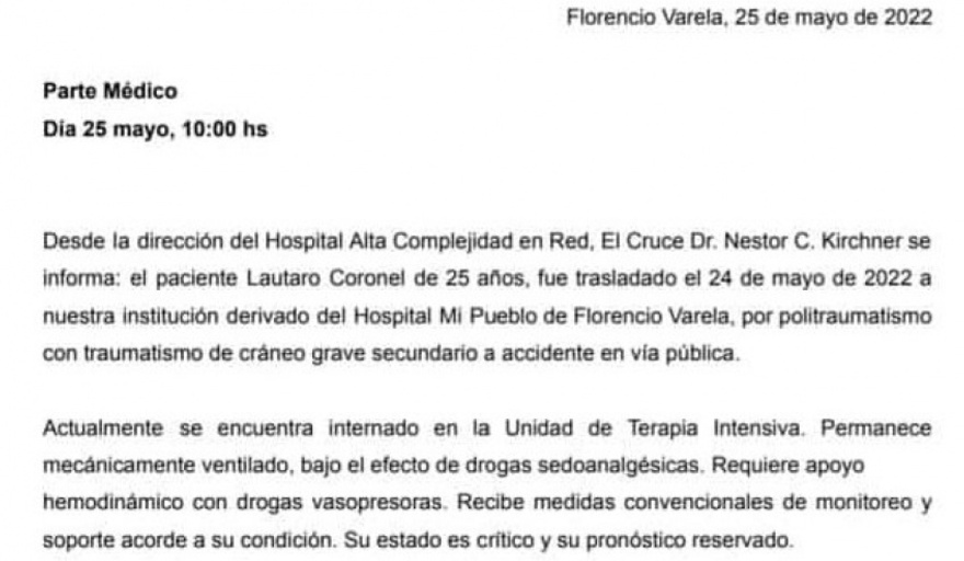 Hace intantes los médicos del Hospital El Cruce de Florencio Varela dieron a conocer detalles de la internación de “El Noba”, el cantante de trap que se accidento este martes. Según indicaron su estado es “grave”.
