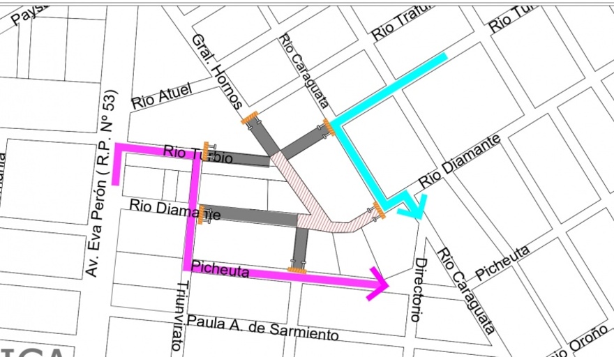 La Comuna prevé una interrupción al tránsito a partir del lunes 3 de abril en las calles Río Turbio -entre Triunvirato y Caraguatá-, Río Diamante -en el tramo comprendido por su empalme con Triunvirato hasta la intersección con Caraguatá-, General Hornos -en el trayecto de Río Traful a Río Diamante- y en Calle 725 -entre Picheuta y Río Diamante-.