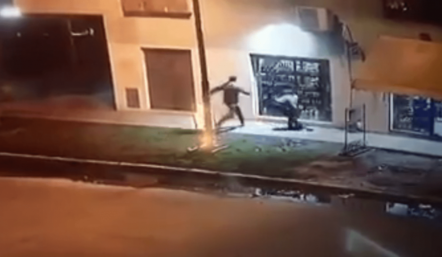 Cámaras de seguridad de la zona lograron registrar el momento en que los dos sujetos hicieron estallar el vidrio del comercio con piedras y fuertes patadas, ubicado en las calles Santa Sofía y Sebastián Gaboto del Barrio San Rudecindo.