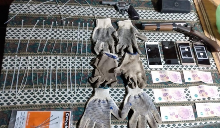 Los sospechosos tenían dos escopetas, tres revólveres calibre 32 con municiones, un arma del tipo tumbera, dinero, precintos y medias de lycra utilizadas como capuchas. Además, las autoridades encontraron en el operativo cadenitas, anillos, aros, relojes de oro, guantes de tela y de látex, celulares, seis bicicletas de alta gama, ruedas de cuatriciclos, un par de zapatillas propiedad de una víctima y varios cuchillos.