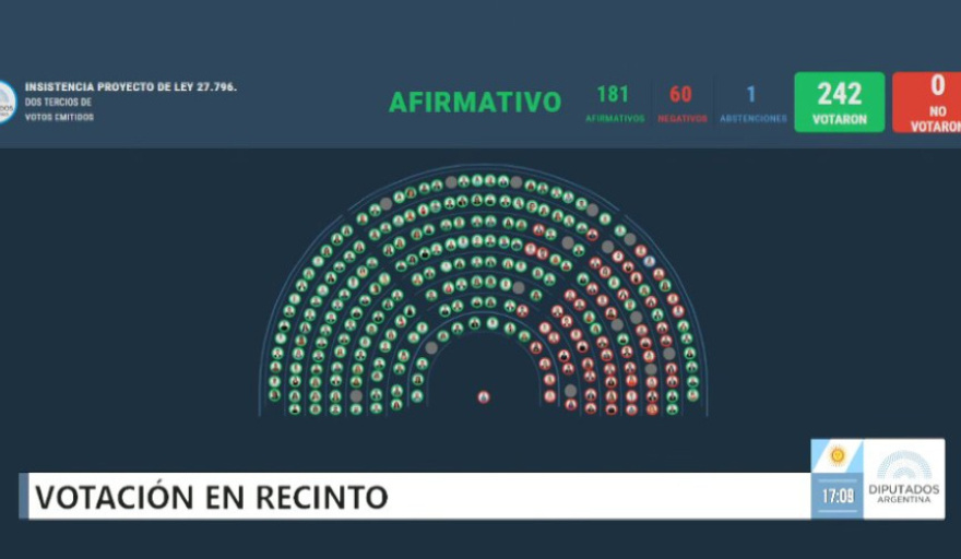 La Cámara de Diputados rechazó hoy por por 181 votos contra 60 el veto del presidente Javier Milei a ley de emergencia del Hospital Garrahan, al conseguir los dos tercios que exige la Constitucional para insistir con una ley.